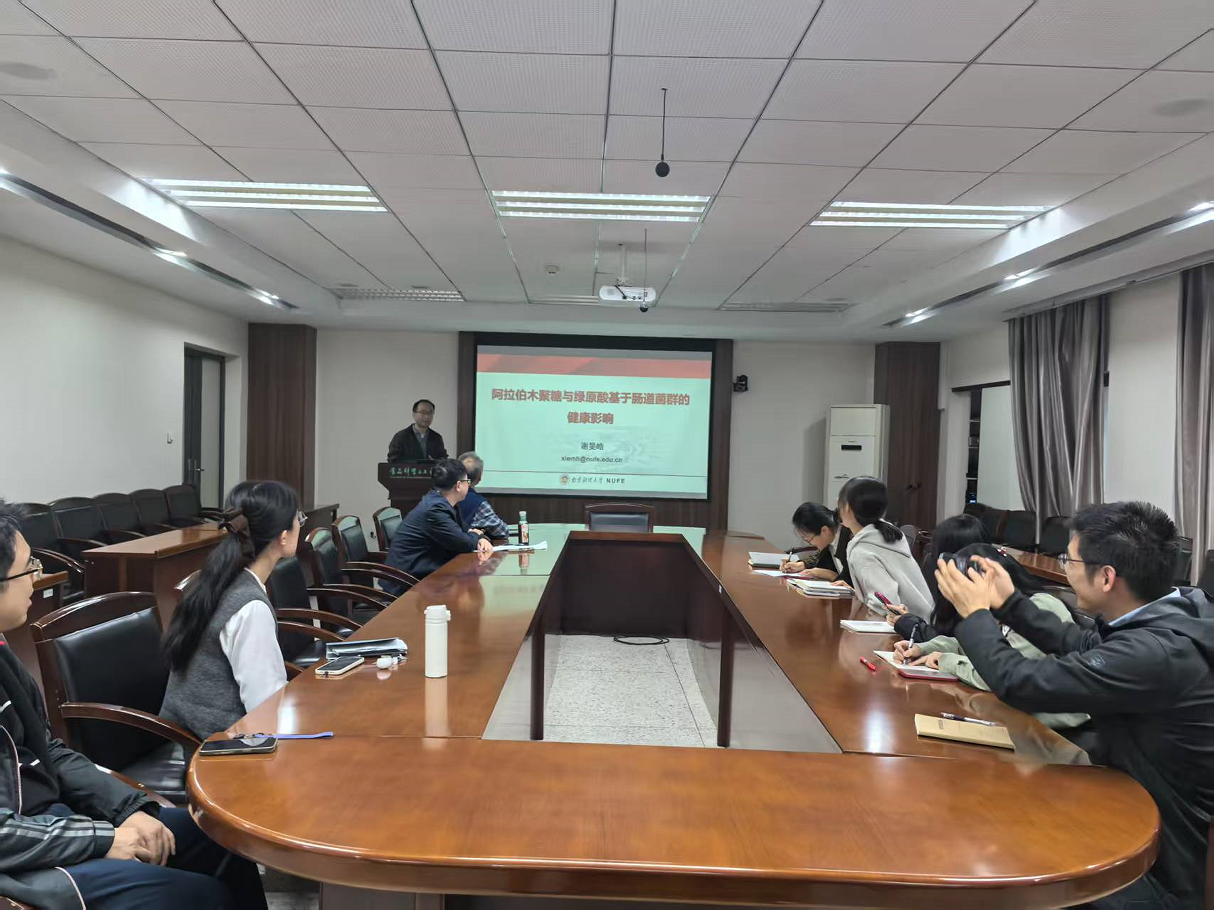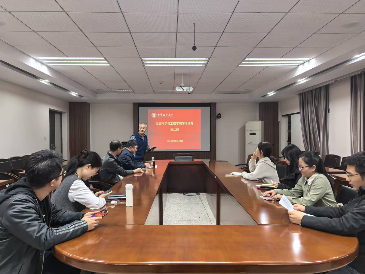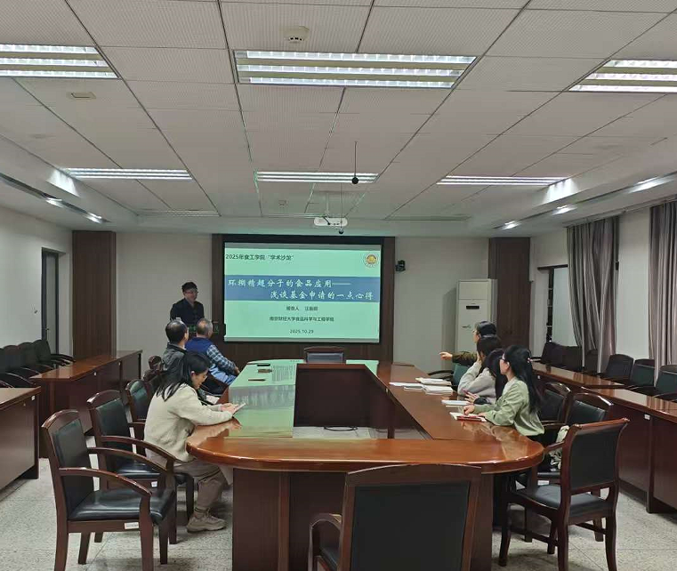 10月29日下午,食品科学与工程学院2025年下半年第二期“学术沙龙”在食工楼211会议室开讲,我院谢旻皓老师和汪振炯老师分别围绕“阿拉伯木聚糖与绿原酸基于肠道菌群的健康影响”和“环糊精超分子的食品应用-浅谈基金申请的一点心得”的作了学术报告。本次活动由沈新春教授主持,学院青年教师及部分研究生到场聆听。