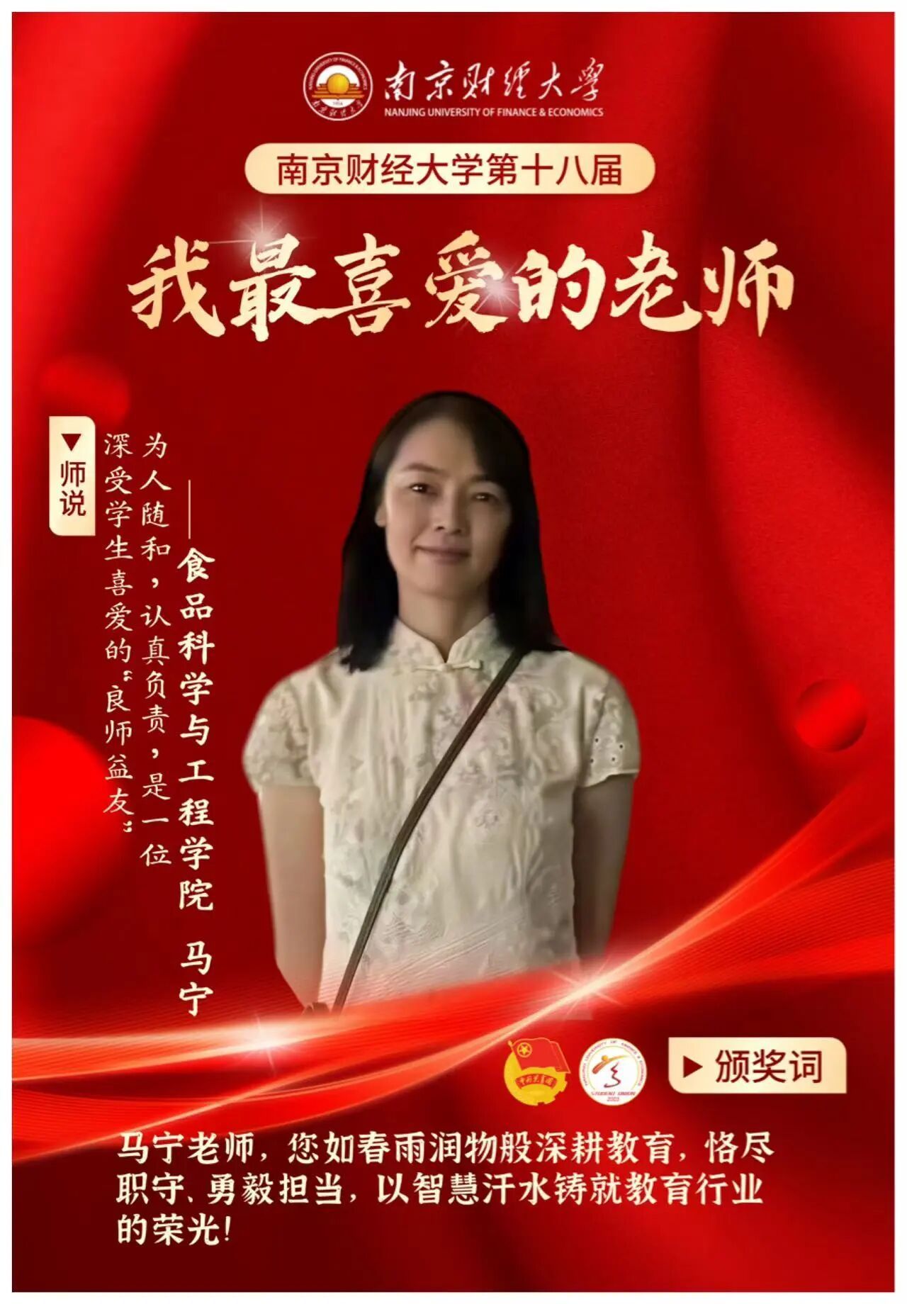 “我最喜爱的老师”评选是南京财经大学弘扬尊师重教传统、强化师德师风建设的重要品牌活动。截至目前,该活动已成功举办十八届,持续选树了一批深受学生爱戴的优秀教师典型。马宁教授的获奖,是我院落实“以生为本”理念、推动教书与育人深度融合的生动实践。 学院将持续发挥优秀教师的示范引领作用,进一步激发全体教师投身立德树人工作的热情,为培养更多具有家国情怀、专业素养和创新精神的食品行业高层次人才贡献力量。