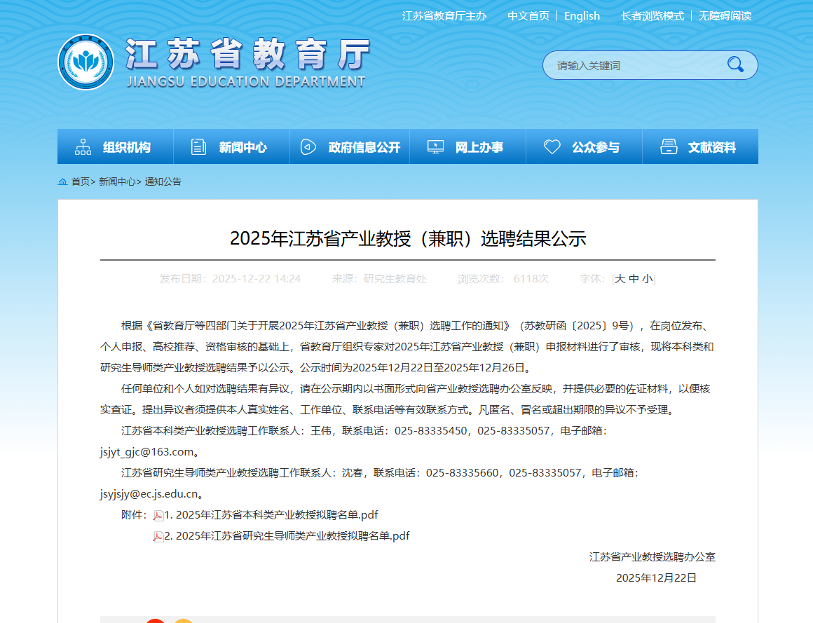 近日,江苏省教育厅、省委人才办、省科技厅、省人力资源和社会保障厅联合发布了《省教育厅等四部门关于开展2025年江苏省产业教授(兼职)选聘工作的通知》(苏教研函〔2025〕9号),此次选聘中,我院获批1位江苏省研究生导师类产业教授。此次入选,是我院在“双师型”教师队伍建设上的又一重要突破,标志着学院产教融合、教育链与产业链耦合发展迈上新台阶,师资结构持续优化。