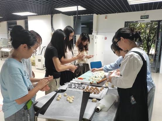 在专业老师的带领下,同学们挽起袖子,开始动手制作月饼。从面粉与白糖的混合,再到面团的反复揉搓,每一步都凝聚着同学们的匠心与热情。大家一起把水油皮分成小份,揉圆按扁后包入油酥,捏紧收口;擀成牛舌状卷起,再擀长卷一次起酥,接着擀成皮裹馅捏实。水油皮与酥油皮的巧妙融合,恰如月之两相,寓意着皎洁与淡雅的和谐共生。而红豆沙与白莲蓉的馅料选择,则象征着温情与热情的交织。正如中秋之月,皎洁淡雅,同学们将两相揉合成一色,包裹着对家乡的思念与对同学的情谊,制作出一个个独一无二的专属月饼。