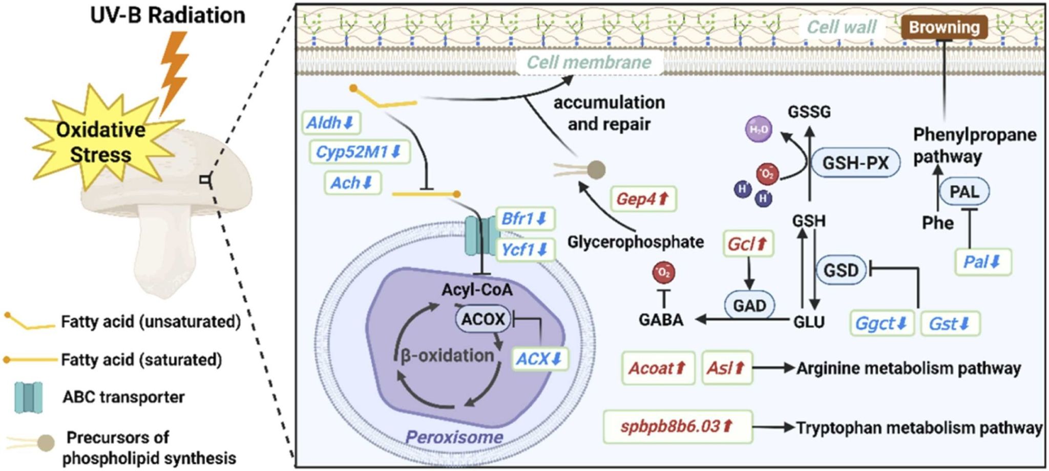 研究发现,UV-B辐照有效抑制了膜脂过氧化进程,降低了细胞膜通透性,减轻了细胞内含物泄漏,保持了细胞膜结构的完整性。与此同时,辐照处理显著抑制了多酚氧化酶(PPO)、酪氨酸酶(TYR)和漆酶(LAC)的活性,与对照组相比分别降低了18.66%、27.75%和15.27%,并下调了相应基因的表达水平。转录组学分析发现,差异表达基因(DEGs)主要富集于脂肪酸代谢、磷脂代谢、色氨酸代谢和谷胱甘肽代谢等关键通路。这些结果表明,UV-B辐照通过“维持膜完整性”与“抑制褐变相关代谢”双重机制,有效延缓了双孢菇采后褐变。