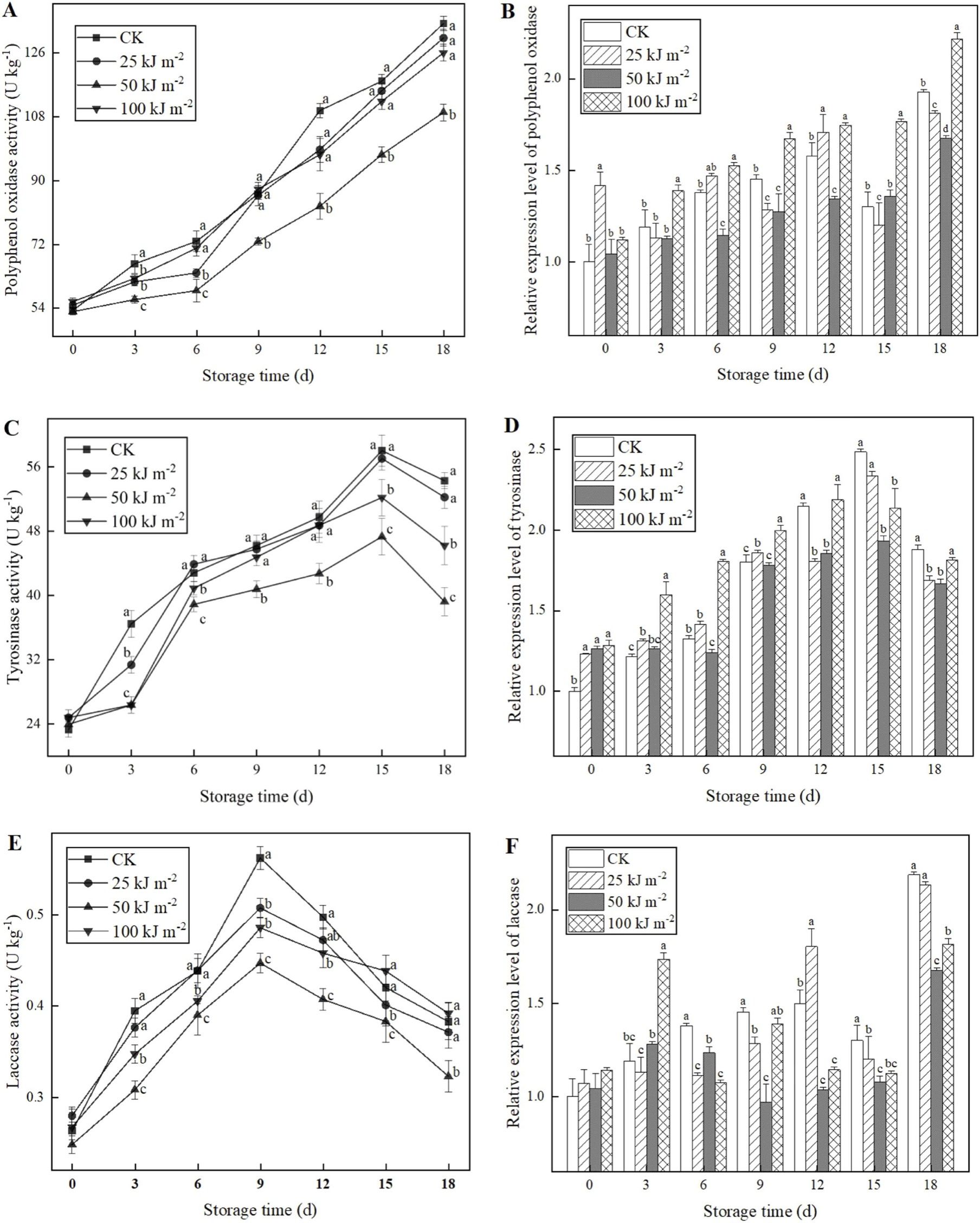 首次从细胞膜稳态角度系统解析UV-B延缓双孢菇采后褐变的分子机制。研究发现50 kJ/m² UV-B辐照可显著抑制膜脂过氧化,降低细胞膜通透性,保持细胞结构完整;同时辐照显著抑制褐变相关酶(PPO、TYR、LAC)活性及其基因表达。