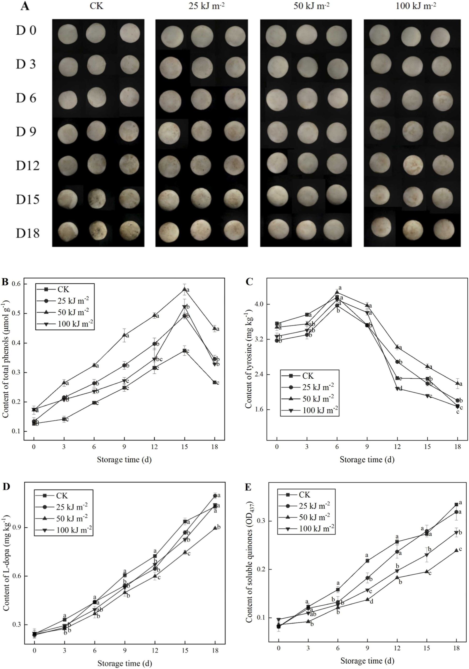 图1 不同剂量UV-B辐照下双孢菇外观变化(A)、总酚含量(B)、酪氨酸含量(C)、多巴含量(D)、可溶性醌含量(E)