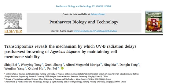 2026年1月26日,南京财经大学食品科学与工程学院裴斐(通讯作者)在国际TOP期刊Postharvest Biology and Technology(Q1,IF: 6.8)发表题为“Transcriptomics reveals the mechanism by which UV-B radiation delays postharvest browning of Agaricus bisporus by maintaining cell membrane stability”的研究性论文。
